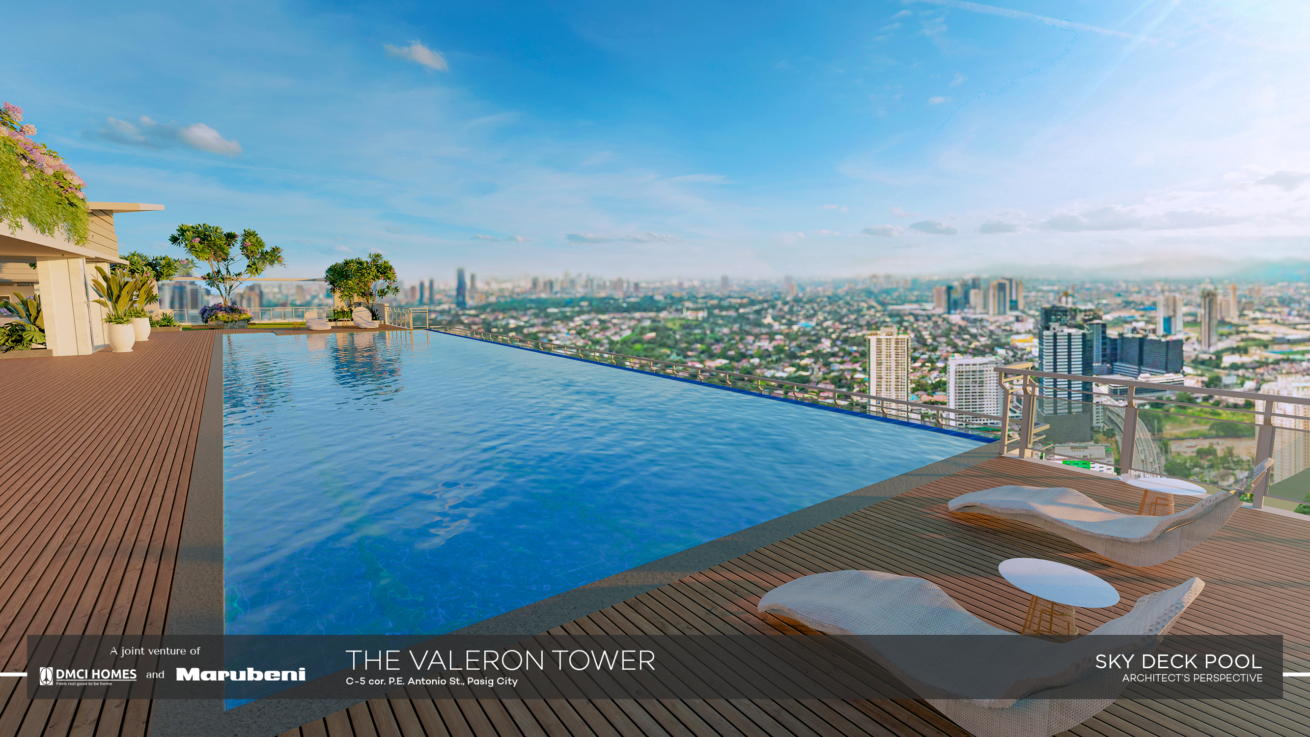 Experience exclusivity and upscale city living at Valeron Towers with more spacious condo unit cuts and expansive 76% resort-inspired amenities. A joint quality development by DMCI Homes, the first AAAA Developer in the Philippines, and Marubeni Corporation, one of the biggest global conglomerates in Japan, with 140 years in business with worldwide investment portfolio that covers infrastructure, real estate, consumer products, transportation, finance, technology, and others.